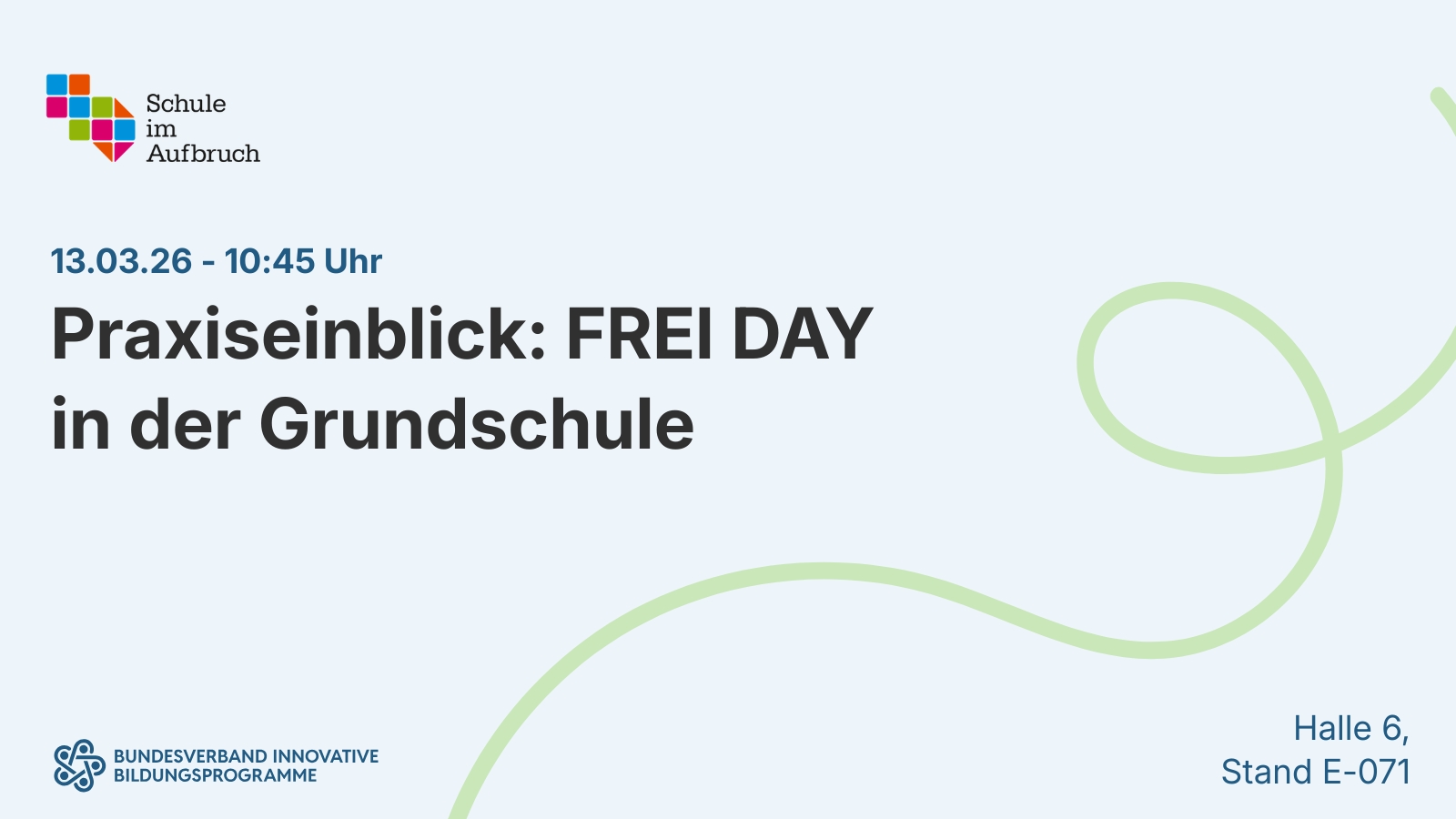 Schülerinnen und Schüler und das pädagogische Team der Schule stellen ihre Erfahrungen aus der Praxis auf der didacta 2026 in Köln vor. Lass dich inspirieren von spannenden FREI DAY Projekten und stelle deine Fragen zur Umsetzung des FREI DAYs an einer Grundschule.